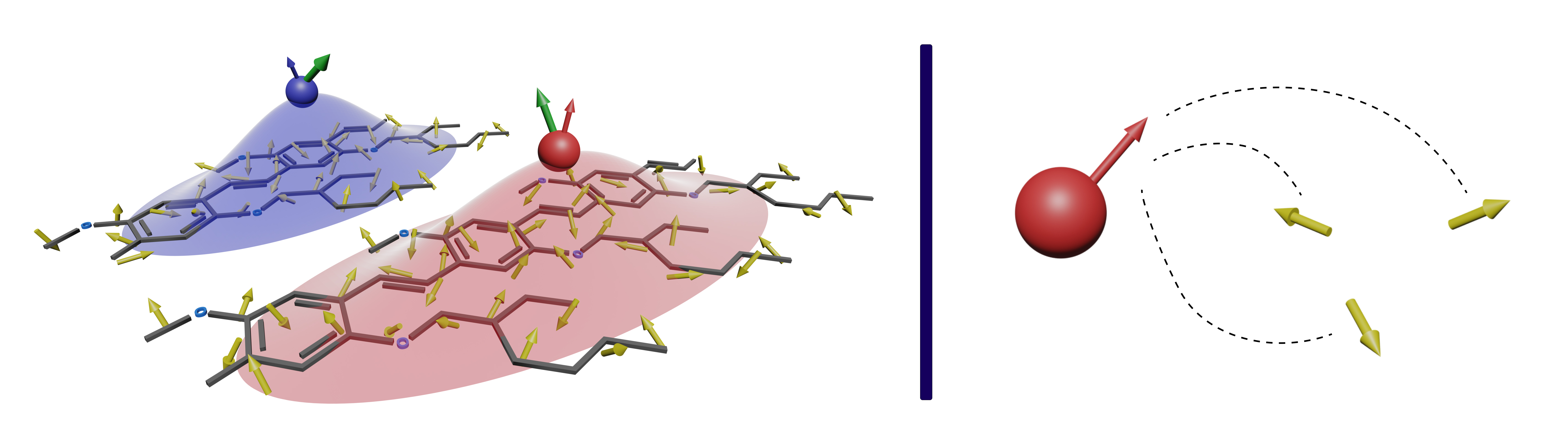Spins of an electron (blue) or hole (red) interact with the many nuclear spins (yellow) of the materials which they reside on. Each of these interactions (right) can be described by a single interactions between the charge carrier and the vector sum of the nuclear fields (green arrow, left) known as the Overhauser field.